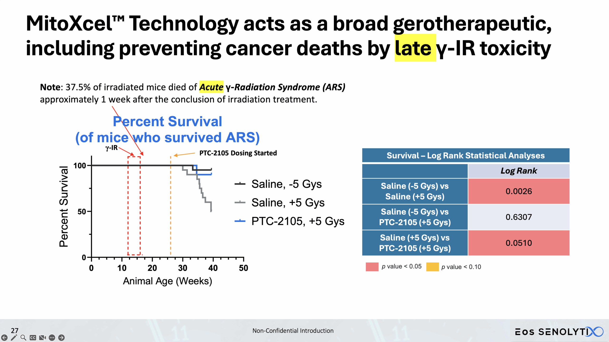 • We unexpectedly observed protective effects from weight loss and death due to late radiation-induced toxicity in mice treated with our lead clinical gerotherapeutic peptide, PTC-2105 compared to saline treated γ-IR-treated controls (p=0.05)